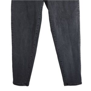 Features: Minimal stretch cotton blend denim fabric in faded black. High rise mom jean fit. Semi-tapered leg. Pockets. Zip to button closure.