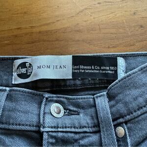 Levi’s SilverTab Mom Jeans In Charcoal Wash in a size 27. Has five pockets and five belt loops. Front zipper and button closure. 99% cotton, 1% elastane. Measures approximately 13 1/2” flat lay waist, 11” rise, 24” inseam. In great condition.