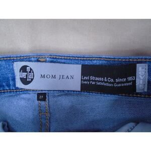 The product is a pair of Levi's Silvertab High Rise Mom Jeans in women's size 27, featuring a stone wash denim fabric with a distressed look. The jeans have a relaxed fit, zip and button closure, and a high rise waist. They also include accents like button and zipper, and come in a solid blue color. The jeans are part of the Levi's Silvertab product line and are designed with features like comfort, stretch, and pockets, making them perfect for a grunge, 80s, or 90s retro-themed style.
