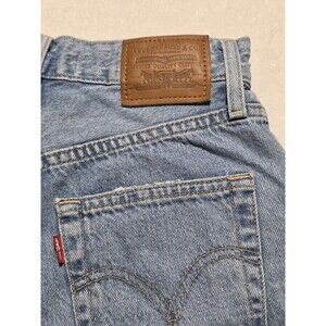 The Levi's Denim Ribcage Shorts in size 25 feature a medium wash with a cutoff style and buttonfly closure, perfect for a casual or travel occasion. Made from cotton denim fabric, they have a high rise and a 2.5" inseam, with a 5-pocket design and a comfortable fit. These blue shorts are ideal for the summer, fall, and spring seasons, showcasing a solid pattern with a classic American or Aloha theme. They are machine washable and designed for a regular fit, making them a versatile and stylish addition to any woman's wardrobe.