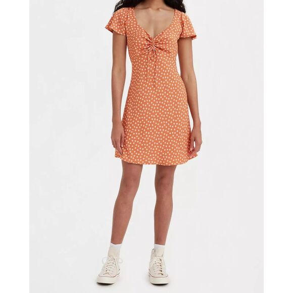 A sweet dress with feminine details. With a princess neckline with tie detail. Featuring fluttery sleeves. Fitted through the body with a flowy skirt