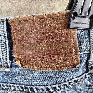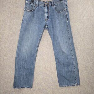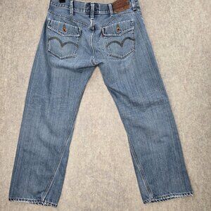 These Levi's Slim Straight jeans embody a timeless style, crafted from durable denim material that promises longevity. With the classic five-pocket design, they offer practical functionality while maintaining a sleek silhouette. The light blue hue provides a versatile aesthetic that pairs seamlessly with casual or semi-casual outfits. Despite showing signs of wear, they retain the quintessential Levi's charm that has been cherished by denim enthusiasts worldwide. The intricate stitching on the back pockets adds a subtle touch of detail to the overall design.