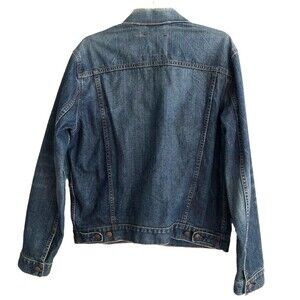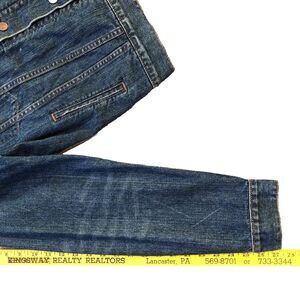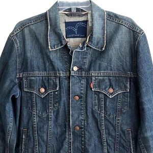 Levis Slim Trucker Jean Jacket Size L Y2k Red Tab Distressed Dark Wash Denim