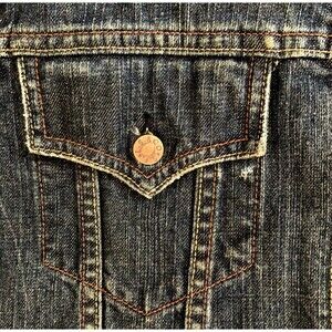 Vintage Y2k Levis Red Tab Slim Trucker Jacket, Lightly Distressed in a Dark Wash Denim.