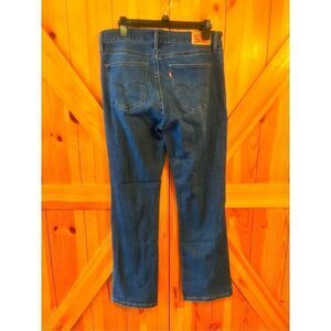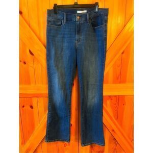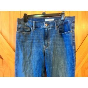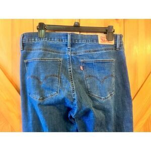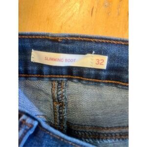 Levi's Slimming Boot Jeans Size 32 Womens Dark Wash Blue Denim measurements 32” waist 31” inseam 10.5” Rise distressed stretchy (3412)