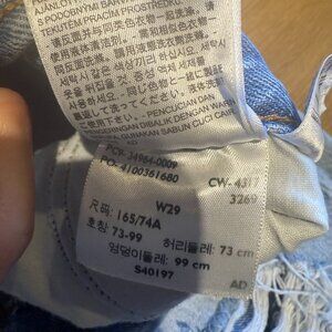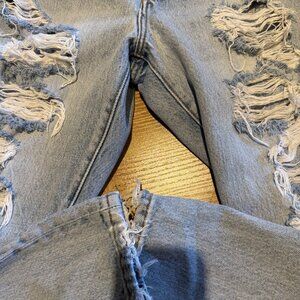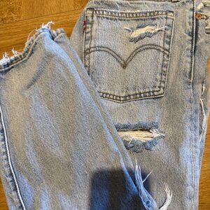 Levi's light blue distressed denim button up jeans. They fit slouchy, high rise but sits just below belly button with distressing along the front of the legs and one slash on the back thigh. I wear size 25 and they fit quite loose on me, tag shows them as size 29. Sits at the ankles, slight taper but not skinny. Perfect to wear with a cropped tank or white tshirt. Very comfortable - has that lived in feel.