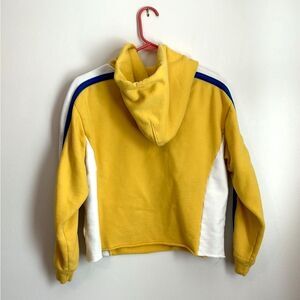 Super cute Cropped Yellow Hoodie with White Stripes down the sides. Blue and White Stripes down Shoulder and Sleeves.