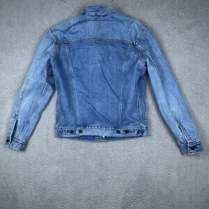 The product is a Levi's Strauss & Co. Men's Hawaii Trucker Jacket in size M and blue denim color. This short-length jacket features a solid pattern with a button closure, perfect for casual occasions. Made with 100% viscose outer shell material and lined with cotton, this regular fit jacket includes accents like buttons and pockets, reflecting a Western and Y2K style. Machine washable and suitable forwinter and fall seasons, this Levi's Trucker Jacket is a stylish and versatile choice for men's wardrobe.