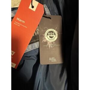 Materials (per tags): Shell 100% cotton denim; faux fur trim 100% polyester; lining 100% polyester; insulated with RDS-certified down by Allied Feather + Down.
