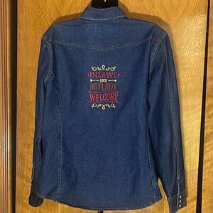 This denim button down cowgirl , coastal cowgirl , rancher, southwestern embroidered back shirt “In-laws and Outlaws Welcome” front shirt chest pockets