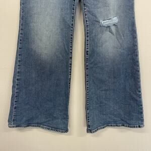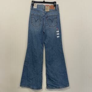 The product is a pair of Levi's Super High Rise Ribcage Bell Flare Jeans in women's size 27 x 32. These medium wash denim jeans feature a solid pattern, zip closure, and a high rise fit. Made from a cotton blend with elastane for stretch, these blue jeans have a flared fit and come with button and zipper accents, as well as the Levi's logo. With a 5-pocket design and machine washable fabric, these jeans are perfect for all seasons and have a retro bohemian style. Crafted by the popular brand Levi's, these jeans are a stylish and versatile addition to any wardrobe.