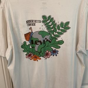 This is a white Levi’s T-shirt with a design on the back. Does have some detergent stains :(