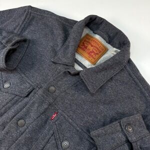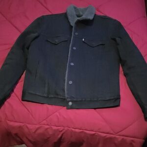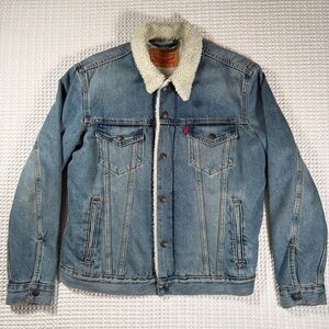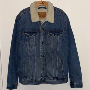 Classic Levi's jacket with cozy sherpa lining. Ideal for work or casual in cooler weather. Trucker type III. Men’s medium. Adjustable waist. Tan.