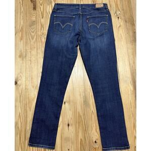 The product is a pair of women's Levi's mid-rise skinny jeans in a dark wash denim, featuring a solid pattern and a stretch fabric for a comfortable fit. These jeans have a zip and button closure, belt loops, and a 5-pocket design with the Levi's logo accent. The size is a 10M with a waist size of 31 inches and an inseam of 29 inches, making them a regular fit with a skinny style. Made from 99% cotton and 1% elastane, these machine washable jeans in blue are a stylish and versatile addition to any woman's wardrobe.