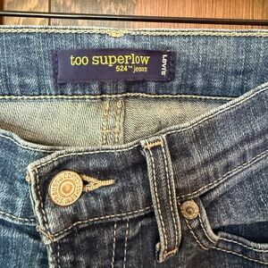 Very cool Levi's 524 Too Super Low Flare Jeans. Sz 3 inseam 32 inches. 99 % cotton 1% elastane incredible slim leg fit with flare at the bottom hem. Flap pockets on the back lift and accent your derrière.