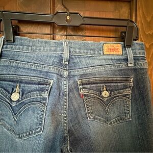 5 pocket jeans. 2 flap pockets in the back with Levi's logo buttons and white and yellow accent stitching. 2 open pockets in the front with coin pocket in one. Rivets on front pockets, belt loops, leather Levi's patch at waist, yellow and white stitching throughout jeans. Hems frayed on purpose.
