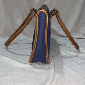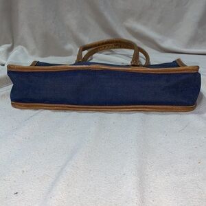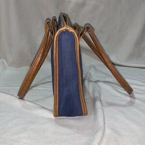Levi’s Tote Bag Blue Denim with Vinyl liner. 8.5” Tall, 13” wide, 3” Deep with dual handles with 8” drop. Handles have some cracks in them. See photos.