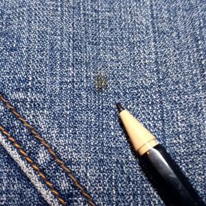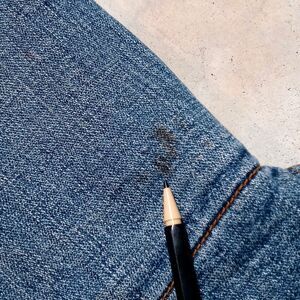 The jacket is pre-owned and has various cosmetic stains throughout (photos 8-11), but it's still in good, wearable condition without any rips or holes.