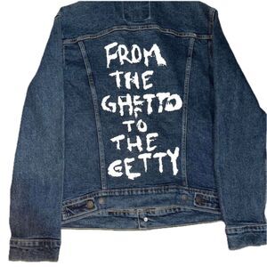 Features: artistic graffiti-like design on the back with the words — "From The Ghetto To The Getty".