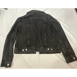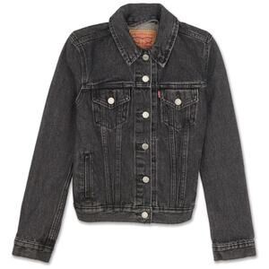 This classic Levi trucker jacket features a washed black denim and is a part of Lev's Water<Less collection, designed to use less water during production while maintaining high-quality durability. This jacket is a men's medium but could be worn by anyone.
