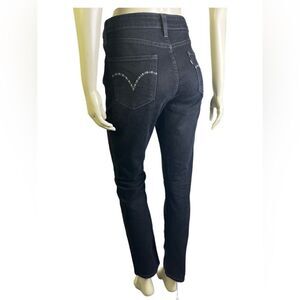 These classic Levi’s Mid-Rise Skinny is unisex, women’s size 10, or 30/32, solid black wash, excellent pre-owned condition in 75% cotton, 24% polyester, and 1% elastic. They feature a typical Jean silhouette with front hip slip pockets, and 2 rear slip pockets. Measurements are as follows: