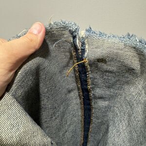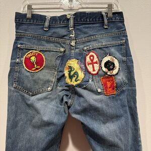 In pre-owned condition. There is a hole between the legs and distressing on the hems and throughout. Raw hems. The holes have patches over them. The knee patch is distressed. See photos.