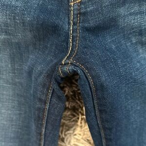 These Levi's jeans showcase a timeless boot cut design in a rich blue hue, offering a perfect blend of style and comfort. The medium to dark wash with subtle fading adds a touch of casual elegance, making them ideal for everyday wear. The clean hem and tailored fit ensure a polished look from thigh to hem.