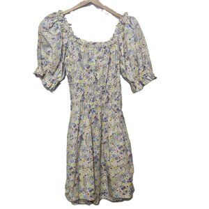 Floral print mini dress with smocked empire waist. Puffed sleeves. Ruffled square neckline. Can be worn off shoulder.