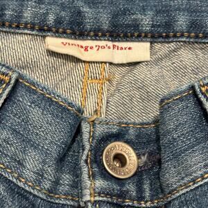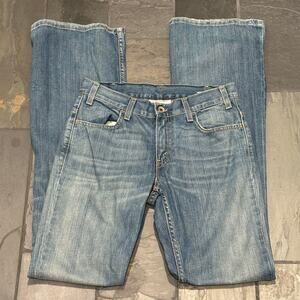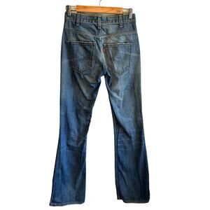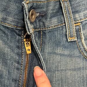Front zip and button closure. Medium wash with slight whiskering, fading and distressing.