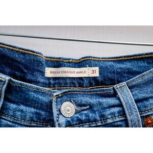 The product is a pair of Levi's W31 L27 Ribcage Straight Ankle Jeans in a medium wash denim with a high rise and a regular fit. The jeans feature a buttonfly closure, a 5-pocket design, and are made of cotton denim in a classic blue color. This pair of women's jeans combines comfort and style, making them a versatile addition to any wardrobe.