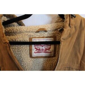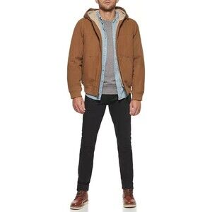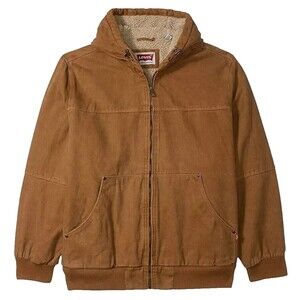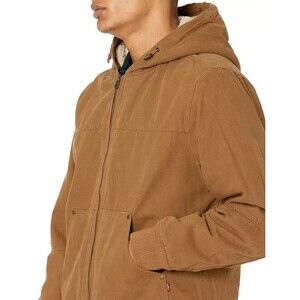 Classic fit features relaxed arm holes, regular body and traditional sleeve openings Insulation for comfort in colder conditions Sherpa lining for added warmth Durable cotton canvas fabric 100% long lasting cotton Attached hood with adjustable metal cord locks Full zip closure Kangaroo pockets Enforced rivet details on lower kangaroo pockets Interior welt pocket for added storage Rib knit cuffs and waist band Levi's signature red tab on side seam Machine washable Color: Worker Brown