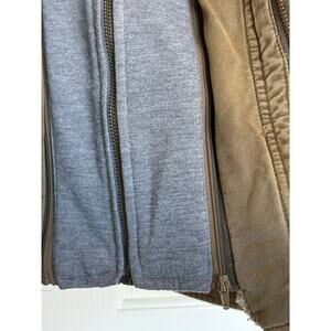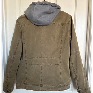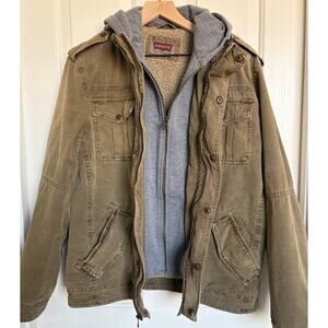 Levis Washed Cotton Hooded Military Jacket Mens M Olive Green Sherpa Lined Faux Hoodie Distressed