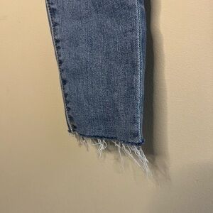 Like new lighter wash with mild distressing. Raw hem. Waist 14.75” Rise 11” Inseam 27”