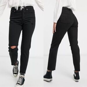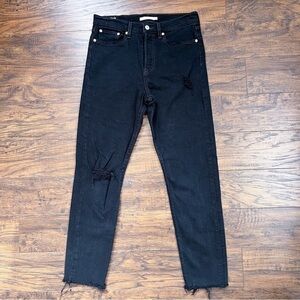 Fabulous high waisted slim leg jeans by Levi's. “Wedgie Icon” style in "Black Desert" (black denim with intentional distressing/rips at knees/raw frayed hem). High rise and button fly. Waist 30-31“, rise 11“, inseam 27“. Size 28, excellent preowned condition.