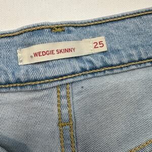 Levi’s Wedgie Skinny Denim Shorts Size 25. Light wash denim. Five pocket styling. Button fly. Small mark on one leg, see photo. Womens size 25.