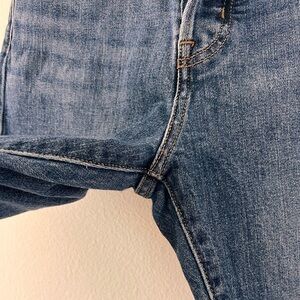 Raw hem, intentional distressing, medium blue wash, high rise, button fly, ankle cropped length, flattering mom jean style