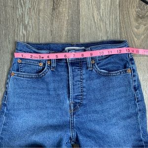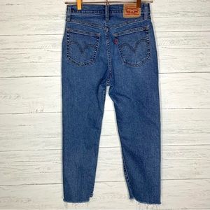 Levi’s medium wash Wedgie Straight raw hem button fly jeans. Size 28, crop styled. Measurements in photos. Excellent preowned condition!