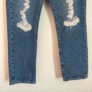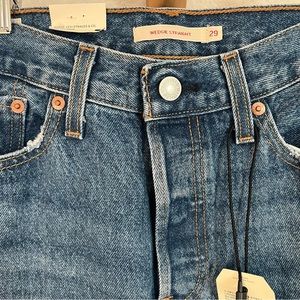 Levi’s Wedgie Straight leg jeans with light distress at thighs and knees. New with tags, size 29 x 28. Hips approximately 38”.