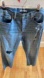 Button fly (hidden buttons). Intentionally destroyed/ distressed as pictured. Revolve style. Raw hem.