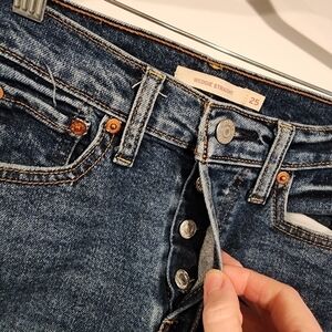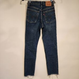 Levi's Wedgie Straight Leg Denim Jeans Distressed Busted Knee Mid Wash Raw Hem Button Fly