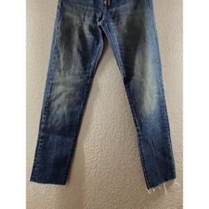 Frayed bottom hem. Button fly. Wedgie cut. High waisted.