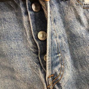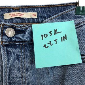 Great condition. Previously owned. Lightly worn. Size 26. Converts to size 4. 10.5 inch rise and 24.5 inch inseam. Cotton and spandex blend material. Levi’s wedgy straight like Jean. Factory distressing. Button fly. Retro style