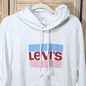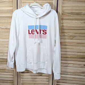 Classic Levi's hoodie in white. Features red and blue logo. Casual and trendy.