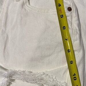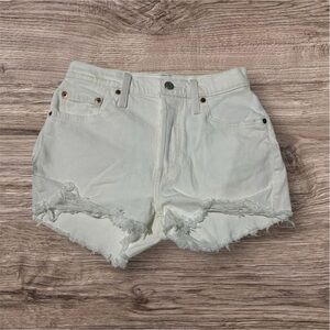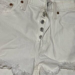 These Levi's white jean shorts boast a chic distressed look with raw-edge hems, offering a casual and stylish vibe. Crafted from high-quality denim, they provide a comfortable fit and a trendy, worn-in appearance. Perfect for laid-back outings, these shorts are a must-have for any fashion-forward wardrobe.
