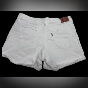 Levi's White Jean Shorts offer a sleek and modern look with their clean, minimal styling and subtle distressed details. Made from stretch denim, these shorts provide a comfortable and flattering fit, perfect for any casual outing. The cuffed hems add a touch of sophistication to this classic design.