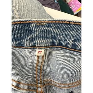 Levis White Oak Cone Denim Light Medium Wash Button Fly Distressed open knee Slim Leg ankle split Jeans