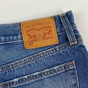 Crafted from medium-wash blue denim, these Levi's jean shorts feature a stylish distressed look with a raw, frayed hem. The slight fading and whiskering add a touch of vintage charm.
