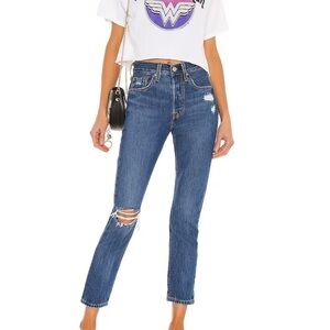Women’s Levi’s 501 Skinny Sansome Winter Dark Wash Destruct Jeans in size 27. Highrise. Button fly. Factory distressing. Functional pockets. Retailed for $100. Pre-owned, excellent used condition- there is writing on interior tag.