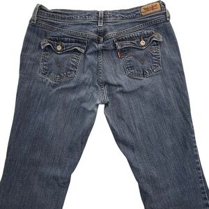 Used good condition women's Levi's Bootcut 515 Blue Denim Size 10 Short Jeans. The back 2 pockets have button closure. Small white mark on front left thigh area, see picture. Colors vary due to lighting. Please see all pictures as they are part of the description and approximate measurements. Ships from a smoke free home.