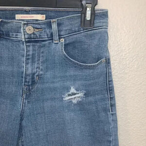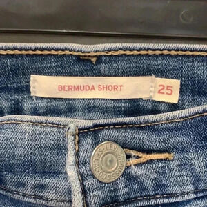 Size 25W Classic longer Bermuda length Levi's jean shorts Light wash blue denim jean with tan stitching Some manufactured distressing on the top half (photos) 5 pocket design, button & zip fly, functional belt loops (approx 13" waist across, 8.5”rise, 12" inseam) Made of cotton polyester spandex - nice stretch Machine washable in cold, tumble dry medium Great gently used condition - some minor wear, no flaws found